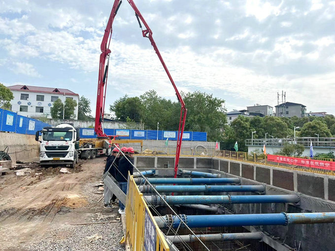 污水處理廠擴(kuò)容工程占地面積0.35公頃,擴(kuò)建規(guī)模1萬m/d,是廬山城鄉(xiāng)污水治理工程重難點(diǎn)工程。工藝流程為:預(yù)處理+BFM工藝+連續(xù)砂濾池,出水水質(zhì)一級A排放標(biāo)準(zhǔn)。包含結(jié)構(gòu)、建筑、設(shè)備、電氣、自控、暖通等專業(yè);新建的構(gòu)(建)筑物有:細(xì)格柵及旋流沉沙池、BFM-B池、BFM-M池、鼓風(fēng)機(jī)房、生物除臭裝置、流量計(jì)井等。此次澆筑的是該構(gòu)筑物BFM-B池底板,基坑尺寸為26.7*13.7*9.45m,地下9.45m;約300立方混凝土。為順利完成澆筑任務(wù),施工前期項(xiàng)目部制訂了切實(shí)可行的施工方案,并對作業(yè)人員進(jìn)行詳細(xì)的技術(shù)、安全交底,精心組織,工序銜接緊密,嚴(yán)格按照施工規(guī)范和操作規(guī)程進(jìn)行,為7月底完成節(jié)點(diǎn)目標(biāo)奠定了基礎(chǔ)。