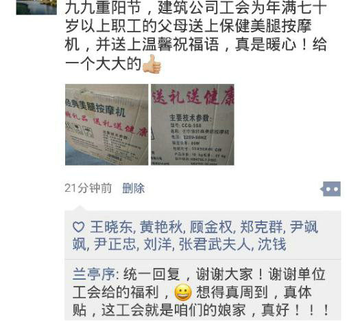 “感謝公司這么貼心的關(guān)愛,在這么一個(gè)特殊的日子里替我們給父母送上一份孝心,真是給了我們一個(gè)不小的驚喜,感謝父母恩情、感謝公司祝福”。職工們紛紛通過各種方式曬出了自己的心情。