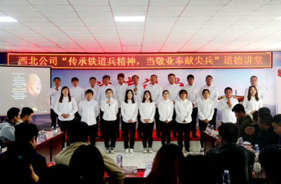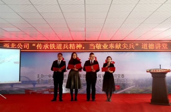 10月16日上午,中國鐵建大橋局西北公司舉辦了以“傳承鐵道兵精神,當(dāng)敬業(yè)奉獻(xiàn)尖兵”為主題的道德講堂活動(dòng)。此次活動(dòng)共分為“省自身”“學(xué)模范”“講故事”“頌經(jīng)典”“談感想”“唱歌曲”和“送吉祥”七個(gè)環(huán)節(jié)。公司黨委書記韓福堂、總經(jīng)理赫宏偉等班子成員,公司機(jī)關(guān)各部室負(fù)責(zé)人,各基層項(xiàng)目書記、團(tuán)委負(fù)責(zé)人及銀昆項(xiàng)目全體職工參加了此次活動(dòng)。
