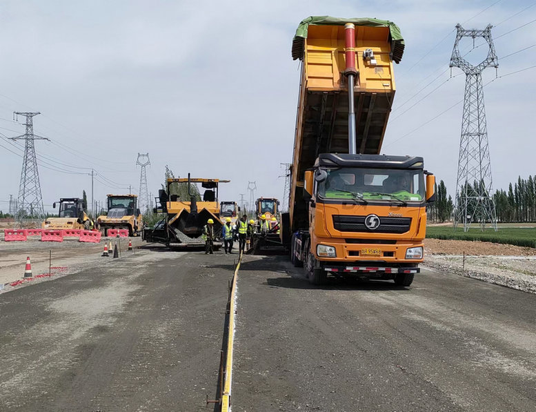 2023年5月20日,北新順通路橋G312線項目部施工現(xiàn)場,在震耳的鞭炮聲中,水穩(wěn)運輸車輛貨箱緩緩升起,水穩(wěn)料傾瀉進攤鋪機儲料倉,水穩(wěn)攤鋪機有條不紊地前進,壓路機來回碾壓基層路面,工人正忙著鋪筑水穩(wěn)層,由北新順通路橋施工的G312線主線K3+800-K4+000水穩(wěn)基層試驗段攤鋪正式開始。