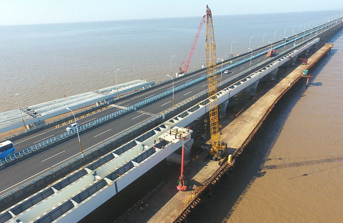 濱?;ネü灿?座拼寬橋,每座設(shè)6跨,分布在金塘大橋東西、南北兩端,每跨需安裝15塊10—17噸重、40厘米厚、5.8米長(zhǎng)、2—3.5米寬的鋼混預(yù)制板。拼寬橋是濱海互通樞紐與既有線甬舟高速金塘大橋連接的重要紐帶。為了保證完成拼寬橋面板與金塘大橋“聯(lián)網(wǎng)”過程中的施工質(zhì)量,中鐵十五局杭甬項(xiàng)目部大張旗鼓地開展"六比六創(chuàng).鐵建杯“勞動(dòng)競(jìng)賽活動(dòng),發(fā)揮全員的最大能量。請(qǐng)橋梁專家和業(yè)主現(xiàn)場(chǎng)指導(dǎo),研究制定了可行性施工方案。橋面板拼接,嚴(yán)格按照設(shè)計(jì)標(biāo)準(zhǔn)定做好各類原材料廠家的選定及報(bào)批工作,在聚合物改性環(huán)氧砂漿施工前,選定符合要求的拌合設(shè)備及拌和方式,并按照廠家提供的配方進(jìn)行試拌,為正式施工提供相關(guān)參數(shù)及技術(shù)支持。同時(shí),對(duì)安裝過程的注意事項(xiàng)、安全防護(hù)、安裝后的成品保護(hù)等方面做好詳細(xì)的技術(shù)交底,以保證安裝質(zhì)量滿足設(shè)計(jì)要求。