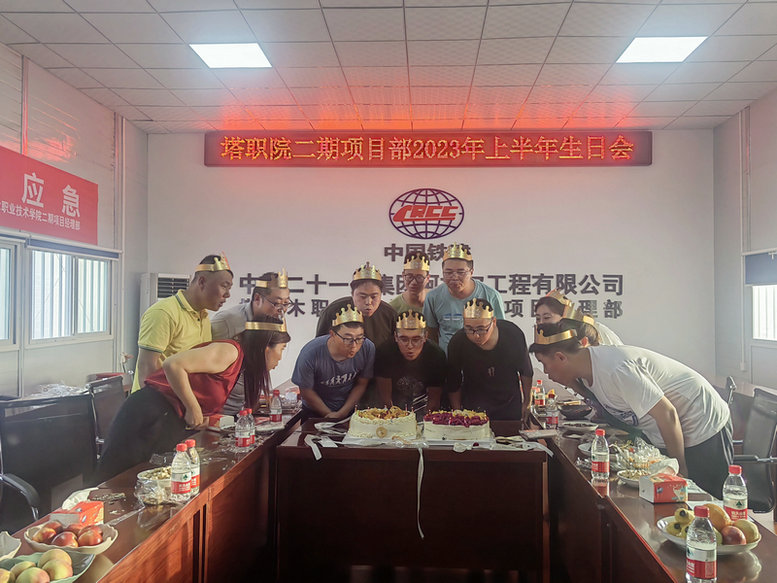 6月9日,中鐵二十一局塔里木職業(yè)技術(shù)學(xué)院二期項(xiàng)目部為2023年上半年生日的職工舉辦集體生日會(huì),讓廣大職工在緊張繁忙的工作之余感受組織的關(guān)愛,心情得到放松。