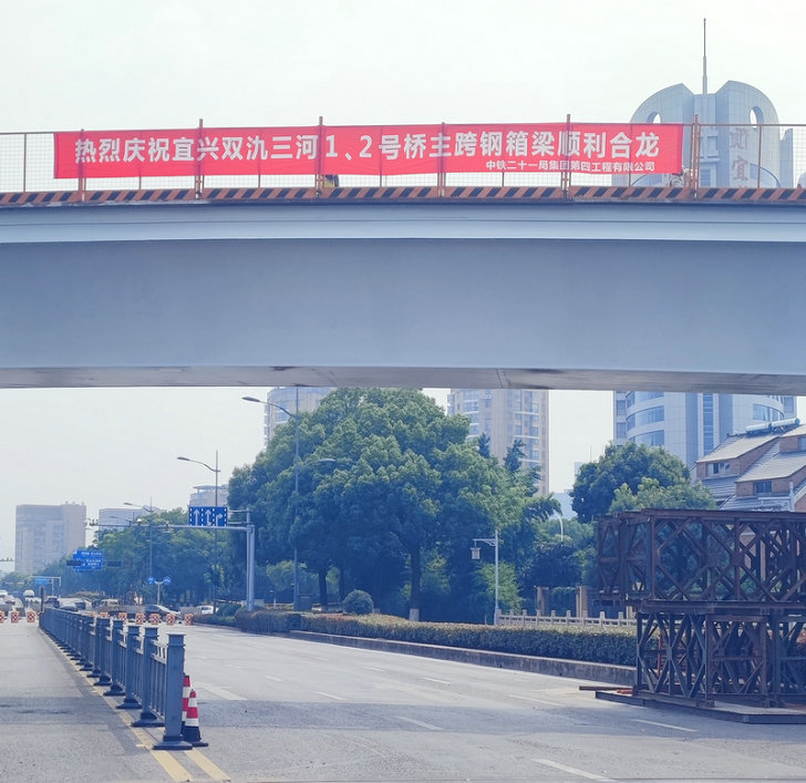 6月11日,中鐵二十一局四公司宜興雙氿三河一期1號橋主跨上跨氿濱大道鋼箱梁順利合龍,標(biāo)志著該橋重點控制性工程圓滿收官。