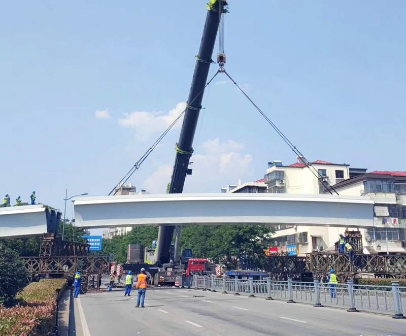 本次封閉施工先后進(jìn)行了封閉道路、安裝臨時支墩、吊裝鋼箱梁、焊接焊縫、安裝護(hù)欄、臨時支墩防護(hù)、開通道路等多道施工工序。在項目部所有參建員工的共同努力下,按時圓滿完成了所有施工任務(wù)。