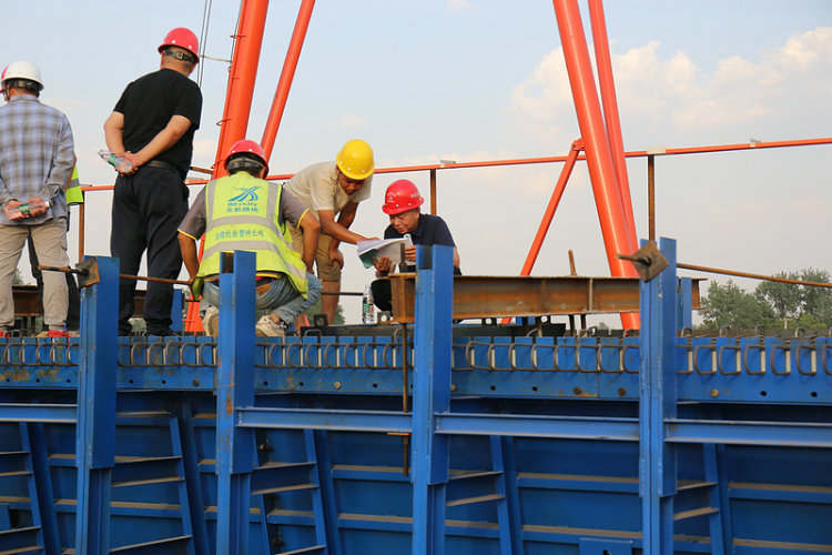 為確保首片預(yù)制箱梁順利澆筑成功,項目部從原材料考察、模板加工選用及澆筑養(yǎng)護控制等方面入手,深入研究、反復(fù)比選,確定了預(yù)制箱梁施工方案。施工前,項目部堅持“方案先行、過程管控”的原則,積極召開專題會,對施工班組進行了分工序技術(shù)交底及安全技術(shù)交底,對原材料檢驗、鋼筋綁扎吊裝、模板拼裝拆除、混凝土振搗等作了詳細講解和分工安排。施工過程中,作業(yè)人員規(guī)范操作、密切配合,技術(shù)人員動態(tài)跟蹤、實時控制,監(jiān)理人員全程旁站、精心指導(dǎo),確保了澆筑順利完成。