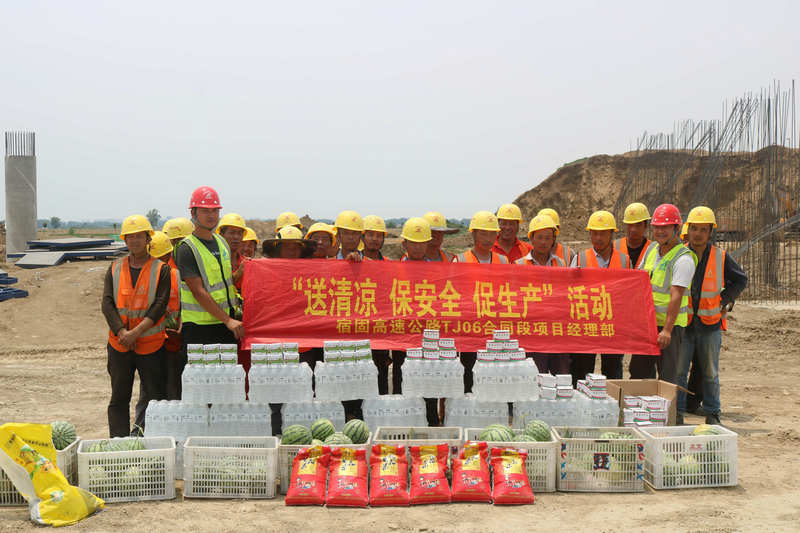 蚌埠訊(通訊員:孫鵬、李天懿)驕陽(yáng)似火,酷暑難擋,安徽蚌埠地區(qū)持續(xù)高溫天氣給一線建設(shè)者帶來嚴(yán)峻的“烤”驗(yàn)。為保障奮戰(zhàn)在一線建筑工人的健康安全,確保施工進(jìn)度順利推進(jìn),近日,北新路橋集團(tuán)長(zhǎng)沙分公司安徽宿固6標(biāo)項(xiàng)目根據(jù)分公司工會(huì)安排部署,組織開展了“送清涼 保安全 促生產(chǎn)”慰問活動(dòng)。