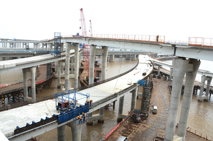 目前,濱?;ネ芰?36片,占470片總量的90.15%,除完成B匝道架梁外, G、E、F、H等4座匝道在之前已經(jīng)架設(shè)完畢,其中F匝道成功上跨金塘大橋,6月25—28日,A、D兩座匝道橋也將上跨金塘大橋。