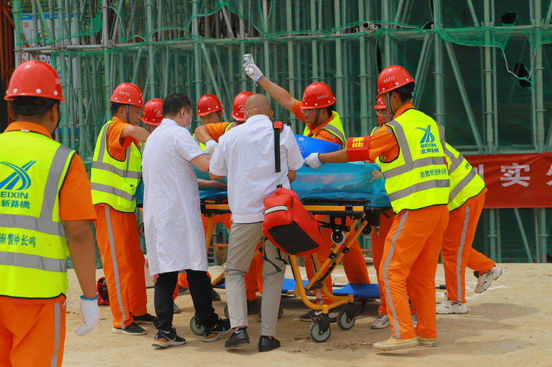 隨著演練總指揮一聲指令,演練正式開始,所有參練人員著裝整齊,按照應(yīng)急預(yù)案分工組織實施。此次演練模擬因天氣較熱,施工人員在爬梯塔過程中腳下踩空,不慎從5米多高的臨邊防護處跌落摔傷,頭部出血,陷入昏迷狀態(tài)。事故發(fā)生后同班作業(yè)人員立即報告安全員,安全員立即撥打救援電話,迅速向上級簡要報告事故情況(事故發(fā)生地點、人員傷亡情況等),立即啟動應(yīng)急救援預(yù)案,并對受傷人員采取臨時救助。救援小組快速判斷事故狀況并拉起警戒線,進行救援。隨著救護車到達事故現(xiàn)場,傷員被安全送往醫(yī)院,險情告一段落。事故調(diào)查組隨即對事故展開調(diào)查,總結(jié)原因教訓(xùn)。