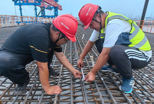 從他到項目以來,由日完成鋼護筒3節(jié)到9節(jié);從日加工樁基鋼筋籠4節(jié)到15節(jié);日產(chǎn)承臺和橋墩鋼筋籠1套到7套;從日拌合混凝土1000立方到高峰期4000立方。在數(shù)量上發(fā)生了質的飛躍,助推濱海高架2021年1月10日順利完工,2022年7月31日濱?;ネ?027根樁基插入海底,12月19日濱?;ネ?69座橋墩順利畫圓,下部結構圓滿收官。2022年9月10日開始預制的拼寬橋面板,當年12月8日完成全部預制任務,并及時運往工地,到目前已架設橋面板314塊。