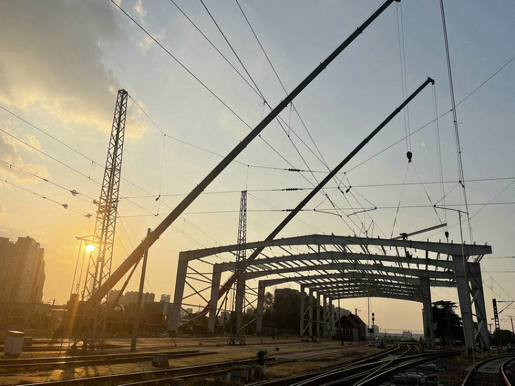 7月17日下午,隨著營(yíng)業(yè)線III級(jí)施工命令下達(dá),鄭州北站作業(yè)棚改造工程最后一次檁條吊裝施工開(kāi)始,施工時(shí)長(zhǎng)為120分鐘,主要進(jìn)行門式鋼架作業(yè)棚屋面檁條吊裝作業(yè)。本次吊裝采用兩臺(tái)130噸吊車進(jìn)行,兩臺(tái)吊車分別吊裝屋面檁條25根。