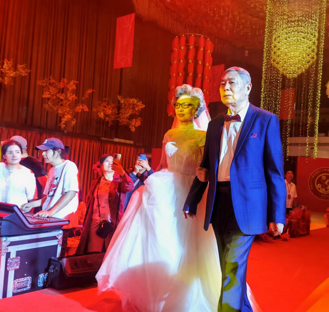 喜結(jié)百年緣,攜手一生情?;槎Y進(jìn)行時(shí),退休老職工杜然精神矍鑠地與相濡以沫50年的老伴牽手入場(chǎng),緊隨其后結(jié)婚40、30、20、10周年的5對(duì)“老工程”夫妻代表依次入場(chǎng),向新人贈(zèng)送五谷禮,并送上深深祝福。每一絲絲白發(fā)都連接著一個(gè)個(gè)項(xiàng)目,每一次次奉獻(xiàn)見(jiàn)證了一場(chǎng)場(chǎng)拼搏。接過(guò)老一輩鐵建人的接力棒,讓光彩的事業(yè)薪火傳承;不忘創(chuàng)業(yè)者的傾情奉獻(xiàn),續(xù)寫(xiě)鐵建人的驕傲和榮光。公司領(lǐng)導(dǎo)的良苦用心感動(dòng)全場(chǎng),雷鳴般的掌聲經(jīng)久不息。