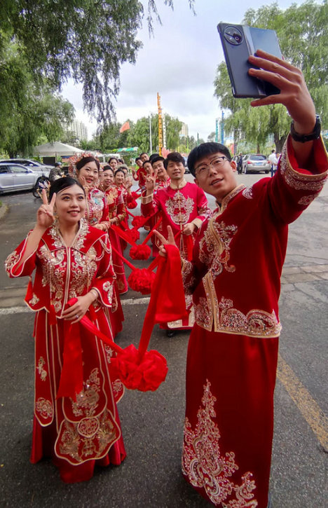 “今天是個(gè)好日子,心想的事兒都能成……”歌聲是對(duì)新人的美好祝福,也是大家的共同期待。緣定新時(shí)代、奮進(jìn)新征程,攜手一起向未來(lái)。 (楊景霜 宋燕軍)