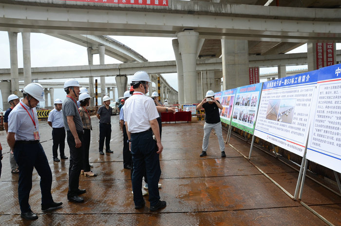 上午10點(diǎn)20分,戴凌云一行來(lái)到濱海互通中心巨幅工程展示牌前,聽(tīng)取了項(xiàng)目部常務(wù)副經(jīng)理喬繼保就工程概況簡(jiǎn)要介紹。公司副總經(jīng)理兼杭甬項(xiàng)目黨支部書(shū)記、項(xiàng)目負(fù)責(zé)人黃偉詳細(xì)介紹了濱?;ネǖ囊?guī)模、工期、安全質(zhì)量、進(jìn)度環(huán)保,以及在棧橋搭建、樁基和承臺(tái)、橋墩施工中跨越海底取水盾構(gòu)隧道、天然氣管道、原油管道、引水管道、500KV海纜、通訊光纜、排污管道等17條管線遇到的安全風(fēng)險(xiǎn)和3條匝道順利上跨金堂大橋、目前橋面施工進(jìn)展等情況。戴凌云環(huán)顧四周的屹立于海上鱗次櫛比的橋墩和凌空飛架的一座座匝道橋很震撼,高興地向黃偉詢問(wèn)工程建設(shè)中如何克服新冠疫情和臺(tái)風(fēng)等自然災(zāi)害等諸多因素,黃偉條理清晰地一一作答。戴凌云說(shuō):“這項(xiàng)工程十五局干得很漂亮,建成后將是鎮(zhèn)海的地標(biāo)性建筑,作為一處壯美的海景供市民和外地游客觀賞。”