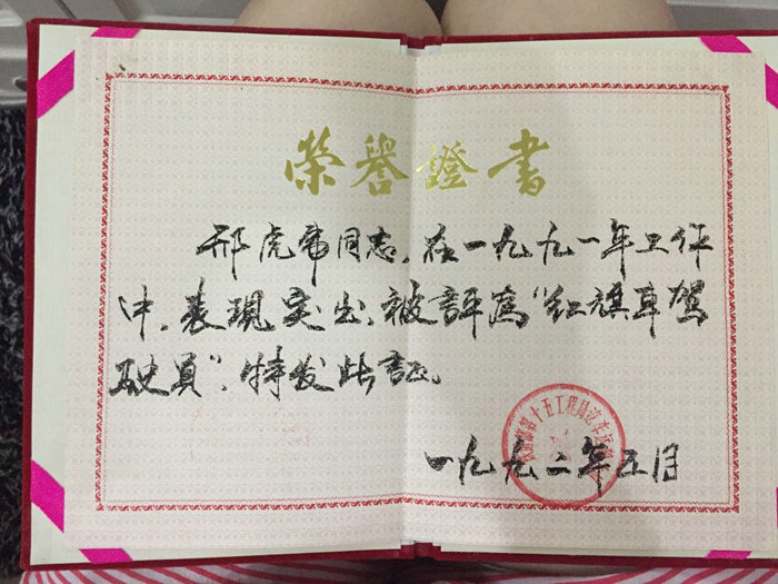 邢虎虎1980年11月應(yīng)征入伍,在總后勤部汽車29團(tuán)七連服兵役。他所在的連隊(duì)有20多臺(tái)“一汽”制造的“解放牌CA10B型”汽車,主要承擔(dān)新疆南疆軍區(qū)對(duì)巴基斯坦和印度邊防哨所換防及其軍用物資運(yùn)輸?shù)墓┙o任務(wù)。那個(gè)年代,“方向盤”、“聽診器”最受年輕人追捧,誰能獲得手握方向盤、胸掛聽診器的職業(yè),那是很有面子的,相當(dāng)于如今的“白領(lǐng)”。他幸運(yùn)地被分到了汽車連,沒當(dāng)修理工、炊事員,沒叫他養(yǎng)豬、種菜,而是被安排學(xué)開車。這與他的理想完全吻合,他高興的幾夜睡不著覺。