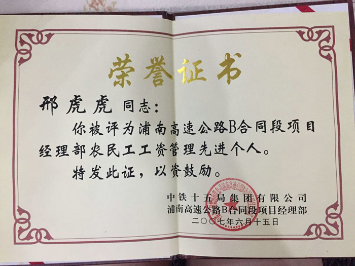 在浦南高速公路施工中,業(yè)主對(duì)農(nóng)民工的工資發(fā)放十分重視,每次檢查,工資發(fā)放是檢查中的重中之重。邢虎虎按照業(yè)主要求,結(jié)合實(shí)際,制定了很實(shí)用的監(jiān)管措施。他在對(duì)新進(jìn)場農(nóng)民工的信息進(jìn)行錄入、備案的同時(shí),每月對(duì)所有在冊人員進(jìn)行張貼公示,并到現(xiàn)場拍照,看在崗人員是否與登記的照片相符,待準(zhǔn)確無誤后兌現(xiàn)工資。這一做法避免了多領(lǐng)、冒領(lǐng)現(xiàn)象,得到業(yè)主和局指的好評(píng),全線多家單位慕名前來參觀學(xué)習(xí)。集團(tuán)公司浦南指授予他“農(nóng)民工管理先進(jìn)個(gè)人”稱號(hào)。