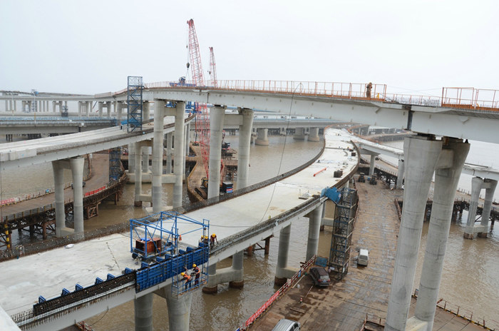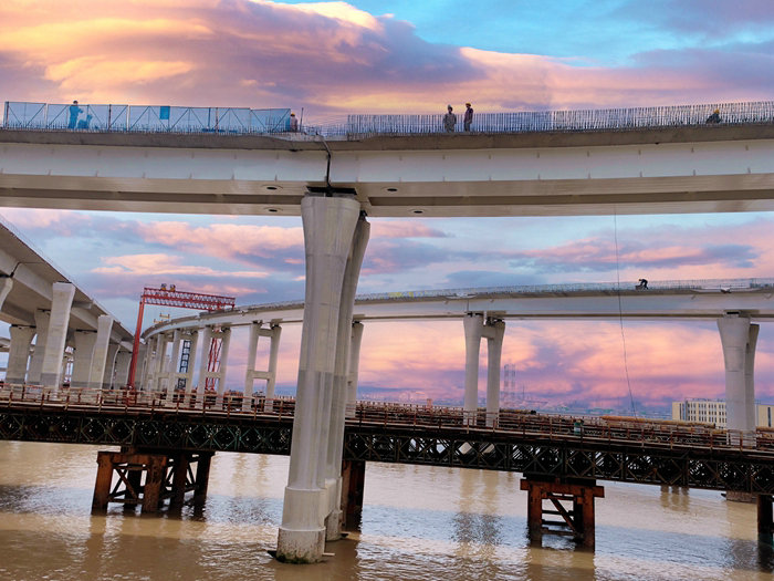 同時(shí),組織多名工人在登高車上,安裝匝道邊緣懸空支架,為立模和安全防護(hù)筑牢第一道防線。有3條匝道凌空飛架在甬舟高速金堂大橋上方,安全防護(hù)是橋面防護(hù)撞欄施工的重中之重,該項(xiàng)目部在匝道兩側(cè)分別安裝了40多米長、1米寬的護(hù)欄,掛上細(xì)密的塑料網(wǎng),施工過程中的碎渣都掉在了網(wǎng)上,保障了海上日均車流量達(dá)6萬左右的既有大橋安全暢通。