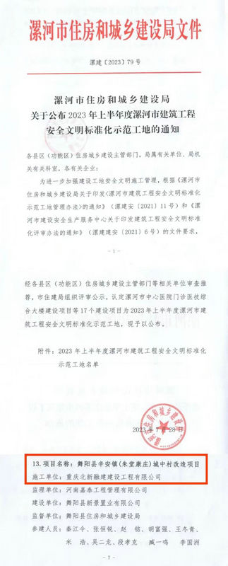 舞陽訊(通訊員:翟倚涵 盧仕磊)近日,河南省漯河市住房和城鄉(xiāng)建設(shè)局發(fā)布了2023年上半年度漯河市建筑工程安全文明標(biāo)準(zhǔn)化示范工地名單,重慶北新融建公司承建的舞陽縣辛安鎮(zhèn)(朱堂康莊)城中村改造項目部(以下簡稱:舞陽房建項目)榮獲“建筑工程安全文明標(biāo)準(zhǔn)化示范工地”稱號。