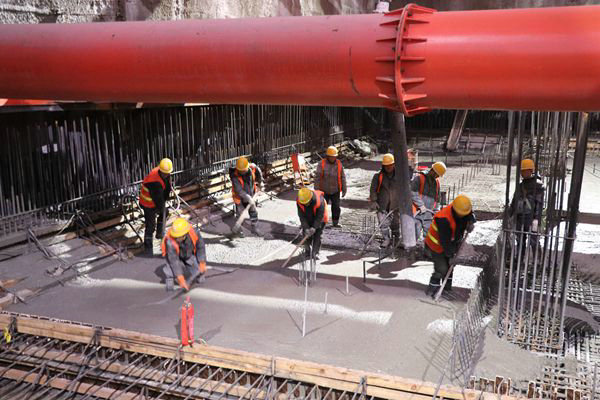 第一流水段長(zhǎng)22.5米,基坑寬21.7米,距起始里程5米處還有一個(gè)長(zhǎng)9米,寬3.35米,高2.39米的廢水池。經(jīng)過(guò)項(xiàng)目部全體員工和主體隊(duì)伍的共同努力,環(huán)島第一流水段終于具備了澆筑混凝土的條件。并于11月11日下午14:30準(zhǔn)時(shí)開(kāi)始澆筑,在澆筑工程中,全體參戰(zhàn)人員發(fā)揚(yáng)鐵軍精神,克服夜間施工、天氣寒冷等多種困難,員工們沒(méi)有一絲絲怨言。