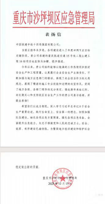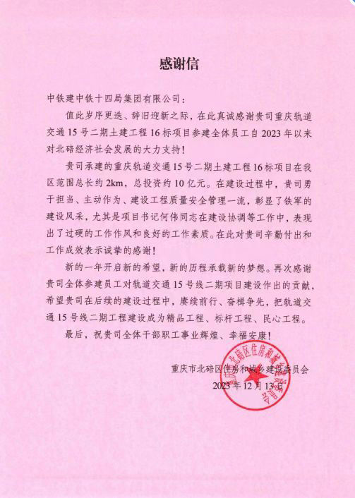 冬寒信暖,備受鼓舞。元旦前夕,中國鐵建重慶軌道交通15號線二期總承包部16標14局項目部收到重慶市沙坪壩區(qū)軌道交通辦公室、重慶市沙坪壩區(qū)應急管理局、重慶市北碚區(qū)住房和城鄉(xiāng)建設委員會等發(fā)來的感謝信,信中對項目部恪盡職守精準履約,施工工序注重水保環(huán)保“綠色施工”常態(tài)化,無煙塵、無噪音工地和棄土外運不擾民給予了高度贊揚,肯定了項目部在施工過程中展現出披荊斬棘的奮發(fā)姿態(tài),孜孜不倦的創(chuàng)新精神。