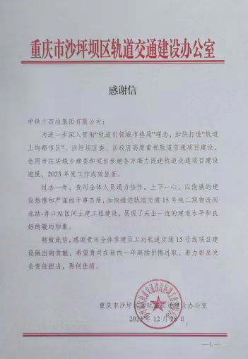 ------重慶軌道交通15號線二期16標項目部收到地方四封感謝信