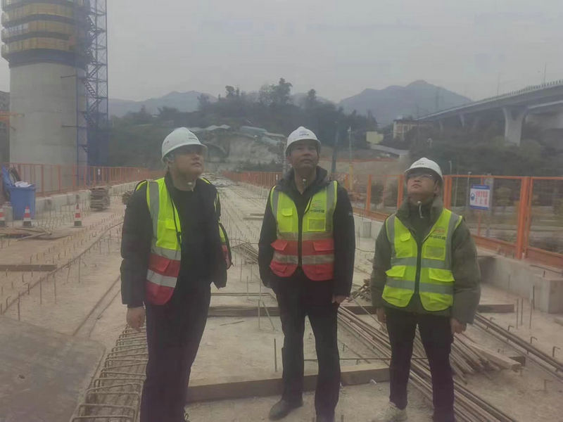 項(xiàng)目書(shū)記韓崇生(左一)帶班深入路橋施工現(xiàn)場(chǎng)“霧查”