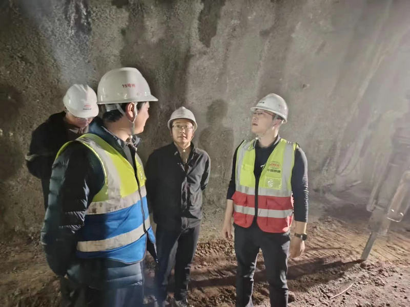 項(xiàng)目經(jīng)理阮超(右一)帶班深入中梁山隧道出口掌子面“夜查”