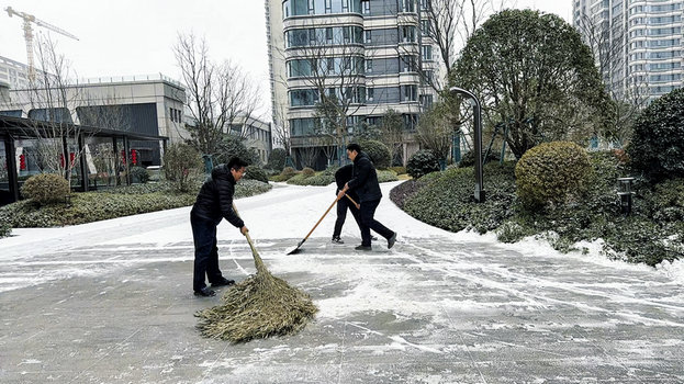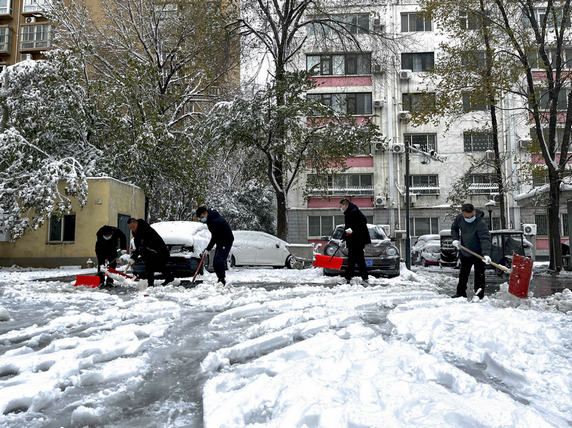 物業(yè)部組織員工在隴海中路11號院小區(qū)掃雪除冰,開辟出行通道。
