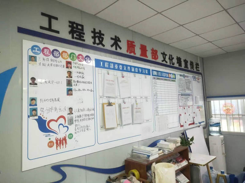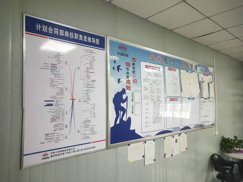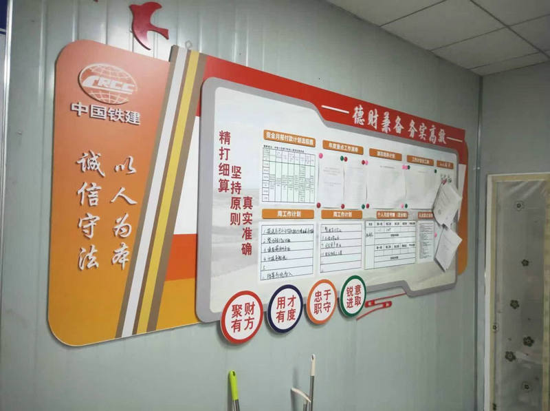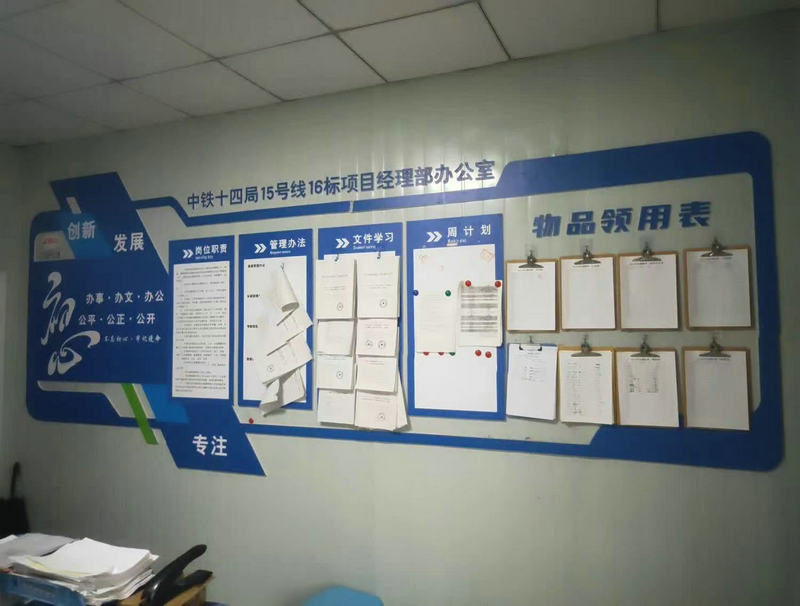 項目部室文化墻是工地文化長廊的組成部分,由崗位職責、管理辦法、文件學習、周計劃、重點提示、團隊風采、每周一說等多個板塊組成,不同的部室所呈現(xiàn)的工作內(nèi)容也不盡相同。從整體布局及涉及部門和個人的工作內(nèi)容,均涵蓋了提高工作效率的審美情趣和價值取向。部室人員透過文化墻各個板塊、鎖定當天的工作內(nèi)容和注意事項,使個人和部門所落實、整改和匯報的等工作條款,不漏項、不缺項完整地實現(xiàn)過程管理,部室文化墻舉目所處是一個“大家庭”,每個工作內(nèi)容即是“家”的一分子,營造出和諧誠信、積極向上的“項目文化”,也是每一位“家人”所應盡的責任“提醒板”。