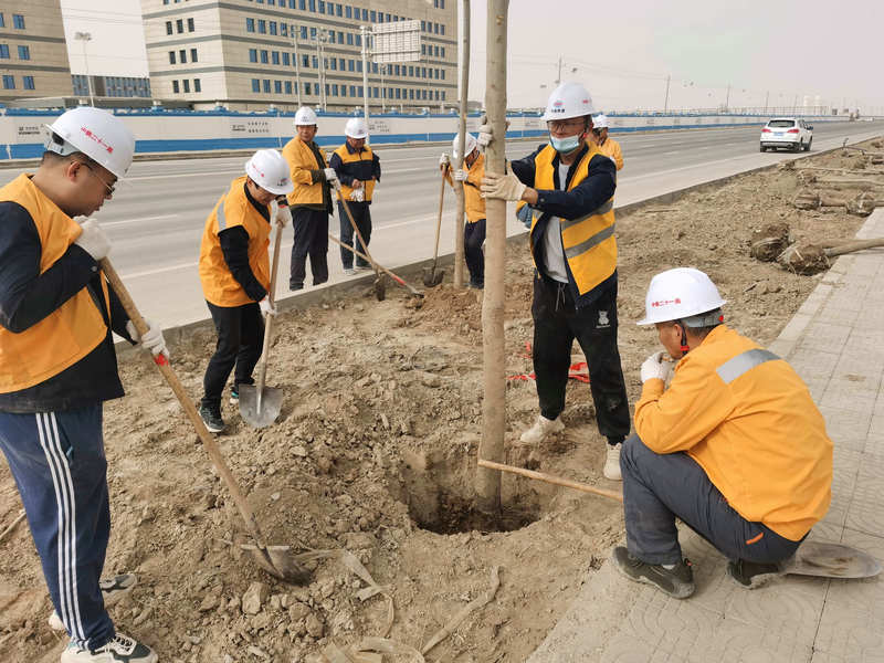 項(xiàng)目部近20名員工齊聚若羌縣園區(qū)站植樹活動(dòng)點(diǎn)。大家身穿工作服,頭戴安全帽,手持鐵鍬,精神抖擻地投入到植樹活動(dòng)中。在植樹現(xiàn)場(chǎng),項(xiàng)目部員工們配合默契,分工明確,有的分揀樹苗、有的鏟土挖坑、有人扶苗培土、有人提水澆灌。大家以“樹”為媒,共同為地球母親播撒綠色的希望。