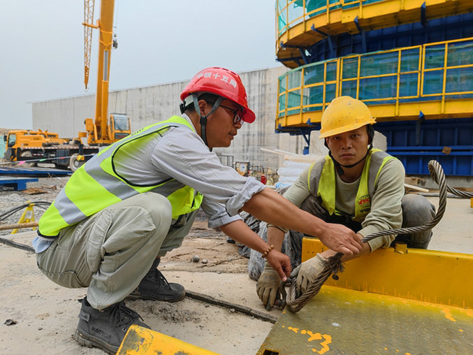 工人在在鋼板上掛鋼絲繩 林茂輝攝