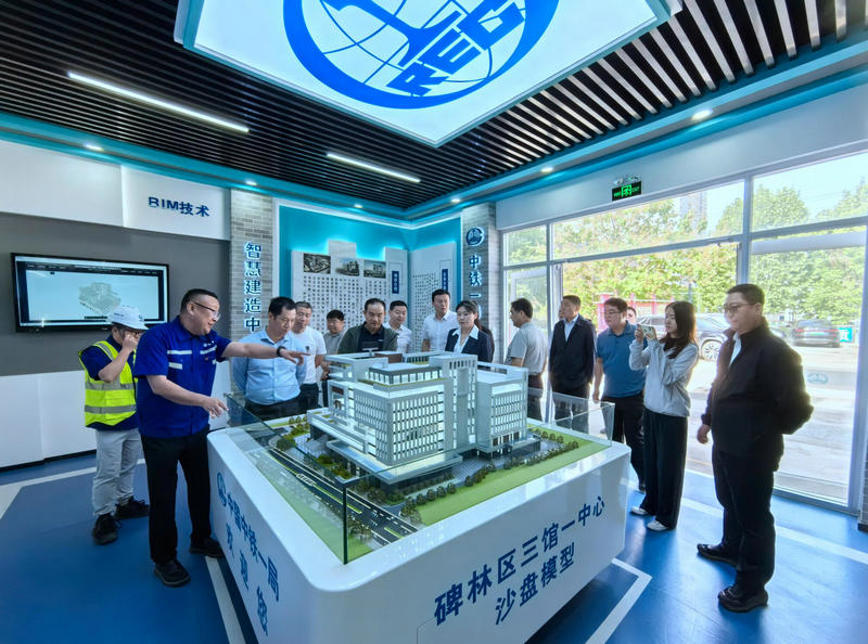 鄧臘一行實(shí)地觀摩了施工現(xiàn)場(chǎng),聽取了項(xiàng)目負(fù)責(zé)人關(guān)于項(xiàng)目概況、施工進(jìn)度以及安全生產(chǎn)標(biāo)準(zhǔn)化建設(shè)等內(nèi)容的匯報(bào)。隨后,調(diào)研組到項(xiàng)目智慧建造中心觀看項(xiàng)目沙盤模型以及智慧建造技術(shù)的應(yīng)用,通過“可視”、“動(dòng)態(tài)”的模型及各功能模塊載體詳細(xì)了解了項(xiàng)目整體情況和項(xiàng)目設(shè)計(jì)中蘊(yùn)含的碑林區(qū)歷史文化要素與理念,對(duì)項(xiàng)目施工標(biāo)準(zhǔn)化、精細(xì)化管理建設(shè)工作表示高度肯定。
