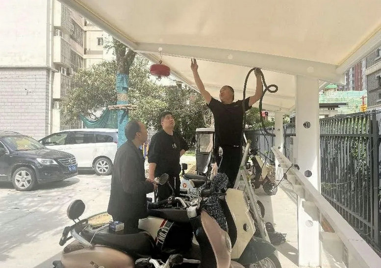 隴海中路11號院 隴海中路11號院新建掃碼充電車棚1處,加裝充電插頭40個,使小區(qū)戶數與充電設備比例達到2:1,從根本上解決了業(yè)主充電難而違規(guī)推電動車入戶的問題。物業(yè)服務中心在車棚內間隔2米安裝了懸掛式溫度感應自動滅火器置,為電動車充電區(qū)配備充足可靠的消防安全設施。