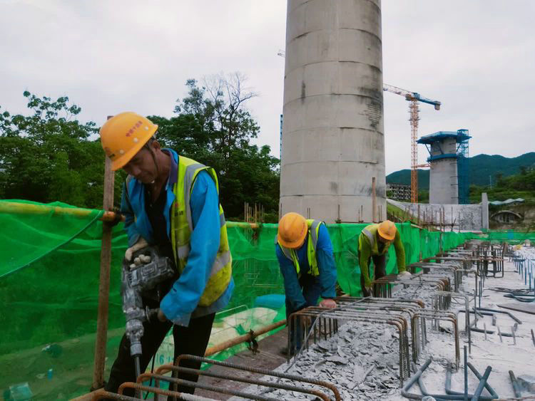 項(xiàng)目部員工在3橋進(jìn)行橋面系聲屏障基礎(chǔ)鑿毛