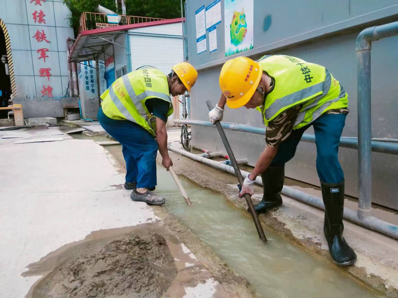 項目部勤雜工申成堂(左)、龔長印(右)清理中梁山隧道進口排水通道