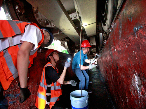 15時(shí)36分,大庫(kù)地溝內(nèi),負(fù)責(zé)給走行部“治療”的乘務(wù)員王翰與他的搭檔,正合力擰動(dòng)機(jī)車(chē)齒輪箱的螺栓,隨即小心翼翼地放出舊油,期間還不時(shí)拿抹布擦拭周邊滴漏的部分。換油的同時(shí),他們還要對(duì)機(jī)車(chē)輪對(duì)及底部部件逐一進(jìn)行檢查,遇到關(guān)鍵部位還要拿出標(biāo)尺進(jìn)行測(cè)量,確保磨耗在規(guī)定限度內(nèi)。