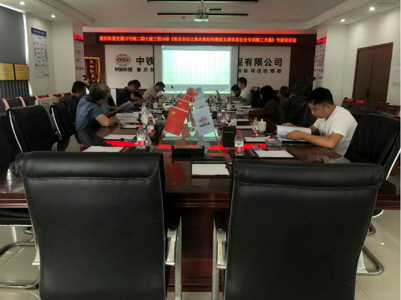5月20日下午,中鐵建重慶軌道交通15號線二期土建工程總承包部18標項目部組織召開《重慶軌道15號線二期歡樂谷站內部結構模板支撐體系安全專項施工方案》專家論證會,專家組成員及建設單位、監(jiān)理單位、設計單位、勘察單位、施工監(jiān)測單位、第三方監(jiān)控量測單位、施工總承包單位和施工單位項目技術負責人或現場代表等相關人員參會,經評審該方案順利通過專家論證。 歡樂谷站為本工程第十一座車站,為暗挖兩層島式車站。車站共設3個出入口,2組風亭,1個換乘通道。本方案涉及內部結構工程為車站中板和端頭襯砌,中板凈寬22.6m,長度229.2m,設計厚度40cm,采用C40混凝土澆筑,端頭二襯總寬24.36m,總高22.8m,采用80cm 厚C40P12防水混凝土澆筑,襯砌主筋為Φ28@150mm,分布筋為Φ20@150mm。
