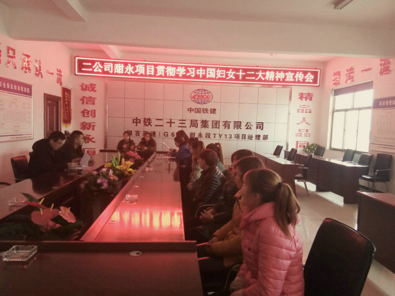 12月21日,中鐵二十三局二公司甜永TY13標(biāo)項目部舉辦了貫徹學(xué)習(xí)中國婦女十二大會精神宣傳會,會議由項目部12位女職工參加, 特邀請了項目經(jīng)理康勇、項目副經(jīng)理唐書恒參加了會議。