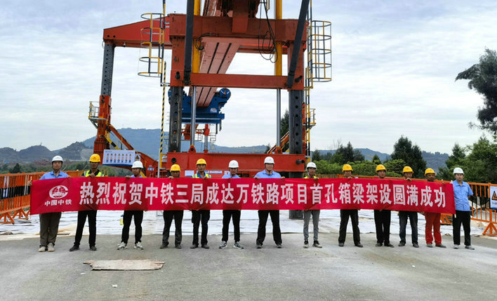 6月6日,在中鐵三局成達(dá)萬(wàn)高鐵站前9標(biāo)架梁施工現(xiàn)場(chǎng),隨著首孔長(zhǎng)32米、重達(dá)約700噸的箱梁穩(wěn)穩(wěn)落在黃花村河舒河特大橋49#臺(tái)—48#墩上,標(biāo)志著由集團(tuán)公司承建的成達(dá)萬(wàn)高鐵箱梁架設(shè)施工正式啟動(dòng),線路建設(shè)迎來(lái)重要進(jìn)展。