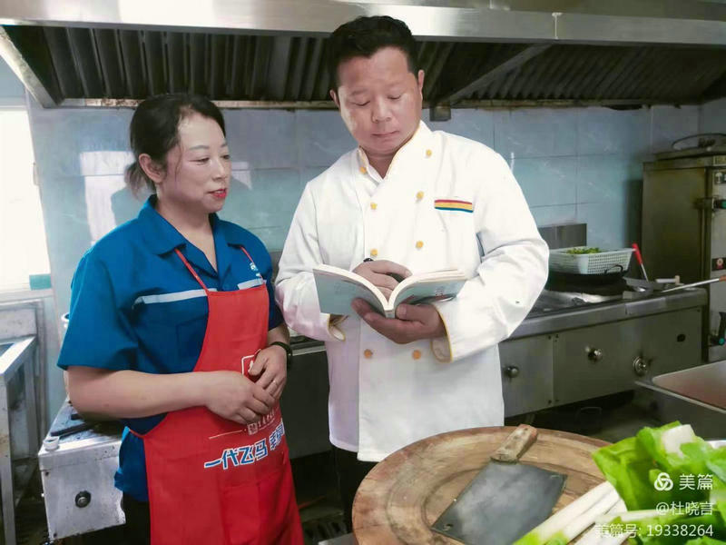 曾在區(qū)政府機(jī)關(guān)招待所掌廚的廚師田慶雷和專業(yè)面點(diǎn)師江偉麗看著“菜譜”為員工調(diào)劑伙食