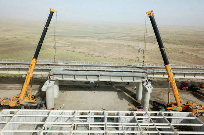 6月21日,隨著兩輛汽車吊將一片長32米、重143.76噸的預(yù)制T梁穩(wěn)穩(wěn)落在臺特瑪湖特大橋上,標(biāo)志著由中鐵二十一局承建的格庫鐵路(新疆段)擴能改造工程全線唯一在橋梁上設(shè)置的會讓站——臺特瑪湖站特大橋首孔T梁架設(shè)成功,工程建設(shè)全面進(jìn)入沖刺階段。