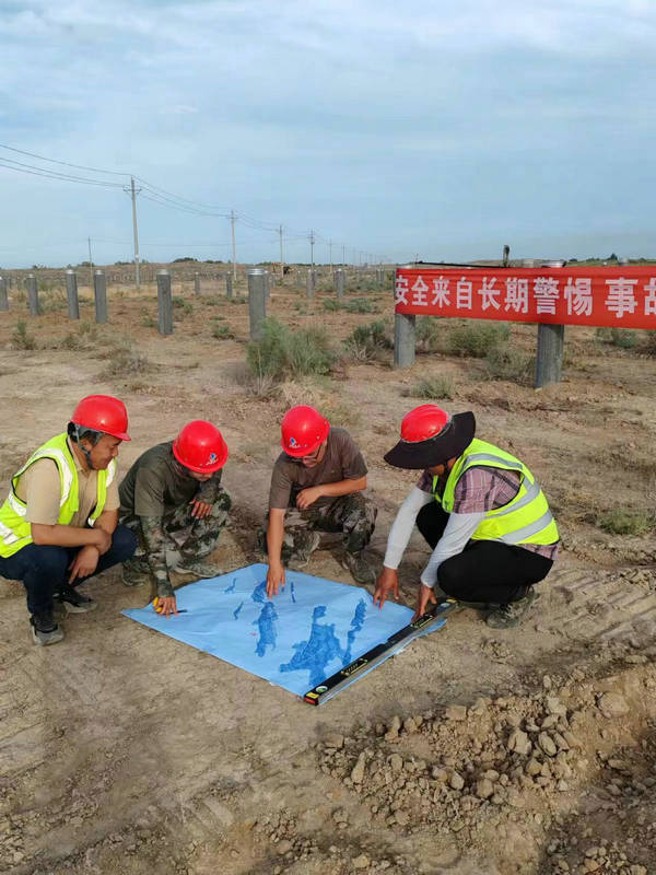 圖為新疆兵團(tuán)建工市政交通集團(tuán)天山公司光伏項(xiàng)目負(fù)責(zé)人、安全員、技術(shù)員等共同審閱圖紙,探討下一步工作計(jì)劃,交流現(xiàn)場(chǎng)管理情況。