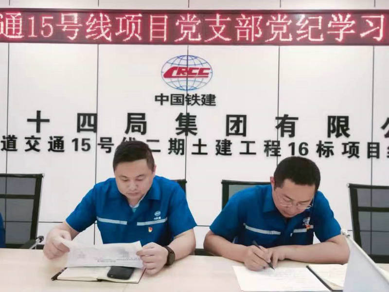 項(xiàng)目黨支部書記韓崇生(左)、項(xiàng)目經(jīng)理阮超(右)組織黨紀(jì)學(xué)習(xí)