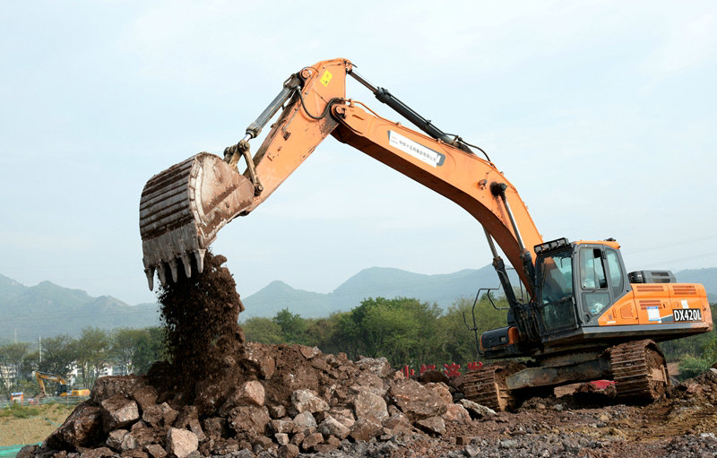 挖掘機作業(yè) 孫永現攝白虎灘樞紐位于常山縣樊溪村上游200米處,主要工程量為1座電站,15孔14米寬、7米高泄洪閘、應急過船設施、船閘、主副廠房等。因項目一半建在常山江河道上,必須先進行圍堰施工,待圍堰具備抵擋洪水沖擊能力,樞紐各分項工程方可進入施工程序。另外,常山江每年4—7月份為每年的主汛期,暴雨和上游20多座水庫泄洪導致常山江水流暴漲、湍急,最大洪峰水位將升高6—8米,座落在江水中的泄洪閘、船閘等必須停工給洪水讓路,汛期過后再復工,與其它3座樞紐情況一樣。