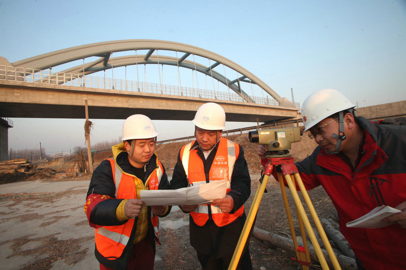 3、中鐵十八局集團五公司建筑公司黨委書記胡興光(中)、唐曹鐵路項目副經(jīng)理劉小林(右)對跨唐津高速簡支梁進行沉降復(fù)測(伍振 白雯 攝)