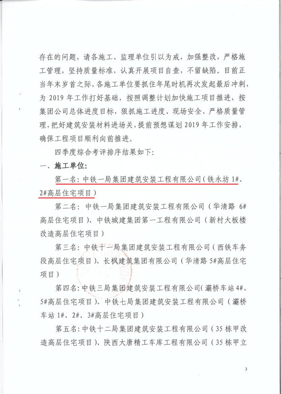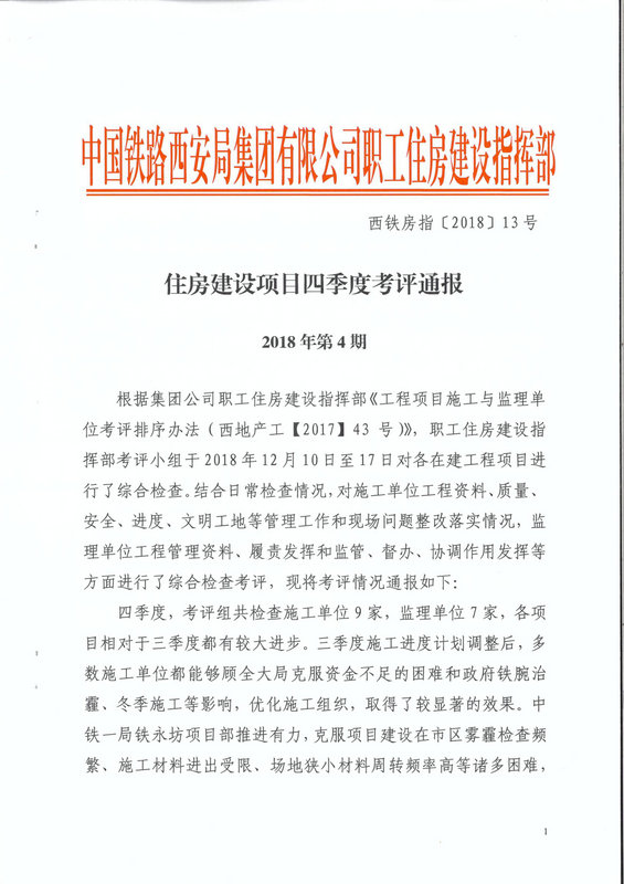 (西安訊)12月29日,西安鐵路局職工住房建設(shè)指揮部通報(bào)了在建9個(gè)項(xiàng)目四季度考評(píng)結(jié)果,中鐵一局建安公司西鐵南郊棚改項(xiàng)目獲得第一名。這是項(xiàng)目本年度第四次也是連續(xù)四次獲得季度評(píng)比第一名,實(shí)現(xiàn)了2018年全年考評(píng)大滿貫。