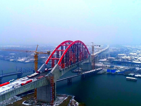鋼管拱弦管混凝土灌注施工難度大、技術(shù)要求高,采用汽車泵和車載地泵接力的方式將混凝土泵送至約60米高空,要同時確保混凝土坍落度達標,灌注連續(xù)性、灌注養(yǎng)護溫度控制在零下7攝氏度~5攝氏度。