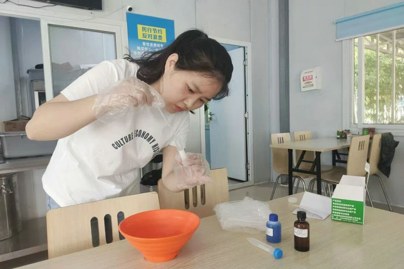 夏秋季節(jié)天氣炎熱,蚊蠅繁殖快,給職工健康帶來一定危害。為保證食堂餐具、職工碗筷干凈衛(wèi)生,項(xiàng)目綜合辦公室人員根據(jù)主管領(lǐng)導(dǎo)安排,按照餐飲衛(wèi)生標(biāo)準(zhǔn),選用一款既經(jīng)濟(jì)又高效快捷的檢測試劑對餐具、碗筷進(jìn)行衛(wèi)生檢測,該試劑能在3-5分鐘內(nèi)快速檢測出餐具表面清潔是否合格,陰離子合成洗滌劑的殘留量是否超標(biāo)。同時(shí),將所有餐具進(jìn)行集中殺菌消毒,讓職工放心地就餐。