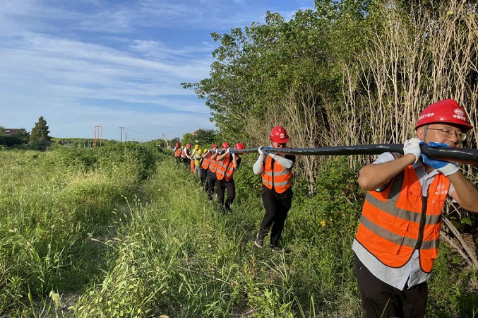 男職工們服從指揮,按指定線路各就各位、分工明確,不怕苦、不怕累。隨著現(xiàn)場(chǎng)“一二三走”的口號(hào)響起,大家擰成一股繩、匯成一股勁,在齊心合力奮戰(zhàn)了6個(gè)小時(shí)后終于完成任務(wù),將現(xiàn)場(chǎng)電纜安全順利拉到位。
