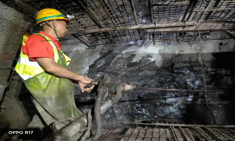 工人在中梁山隧道作業(yè)現(xiàn)場(chǎng)鉆炮眼