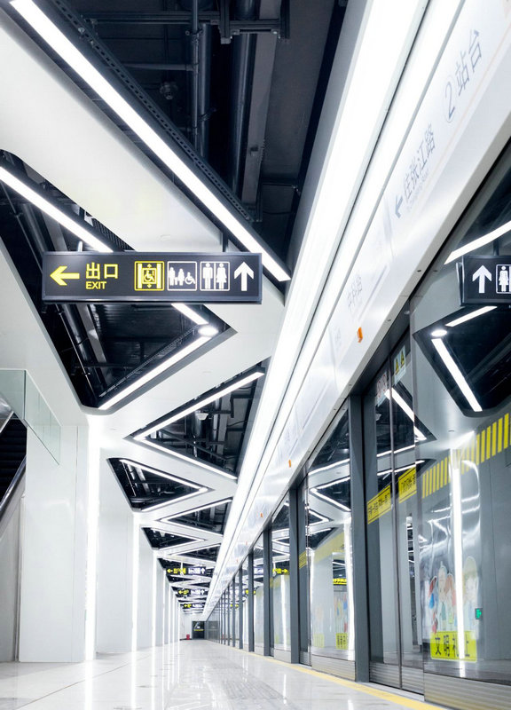 作為張江科技城的門戶車站,中科路站的裝修理念也是極具時代氣息。鏡面不銹鋼構(gòu)成的石墨晶體結(jié)構(gòu)吊頂,地面上鋪滿黑白相間的幾何圖形,站廳中央的巨幅LED大屏實時展示地鐵建設(shè)運(yùn)營的最新動態(tài),機(jī)電設(shè)備房裝修與色彩交相呼應(yīng)。